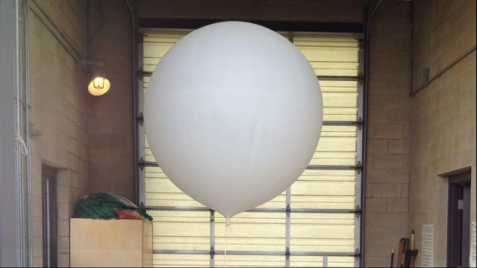 Balloons are inflated to 5 feet in diameter with a rope tied at the base leading to a radiosonde at the bottom of the rope.