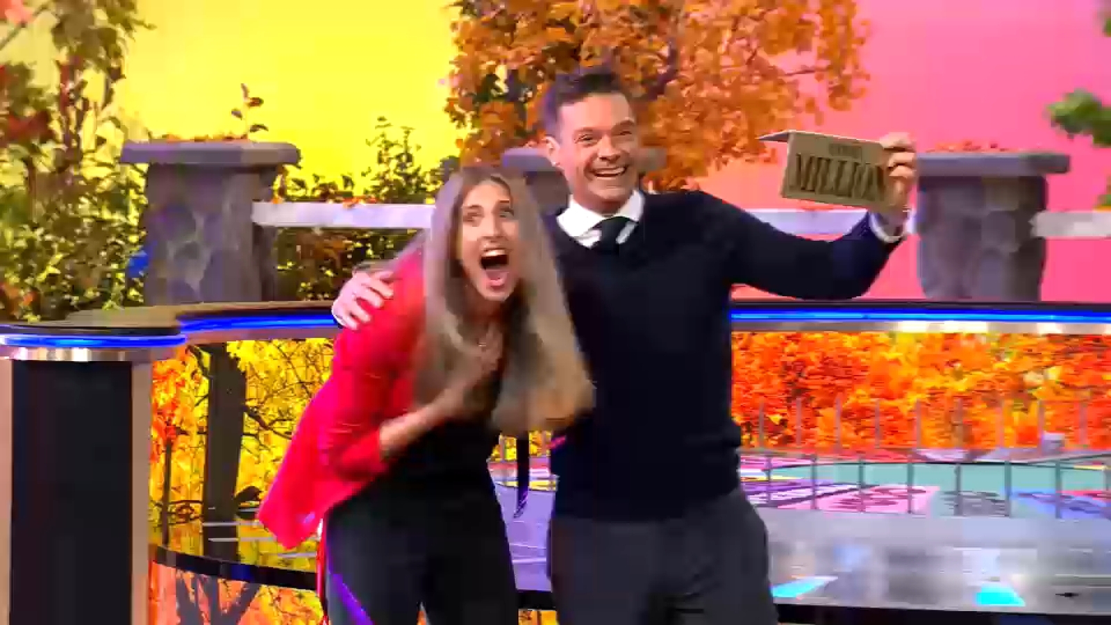 Co-host Vanna White hugged her, saying, "I'm so happy for you!" Seacrest added, "Congratulations, you're my first million-dollar winner. I have a tear in my eye."