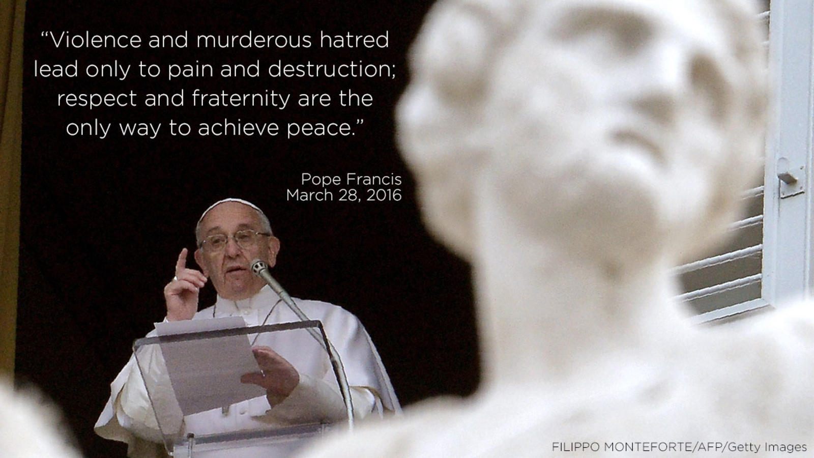 "I repeat, once again, that violence and murderous hatred lead only to pain and destruction; respect and fraternity are the only way to achieve peace," he said, according to Vatican Radio.