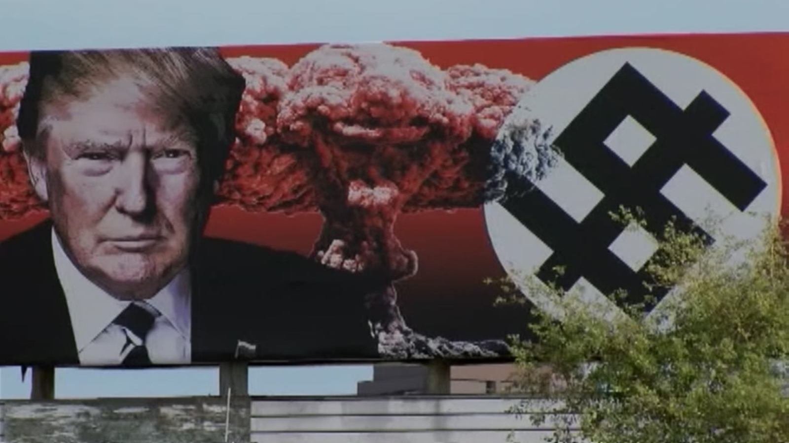 The sign over downtown Phoenix shows Trump alongside mushroom clouds, swastika-shaped dollar signs and the Russian flag. Along the back, five fists form the sign language letters for the word "unity."