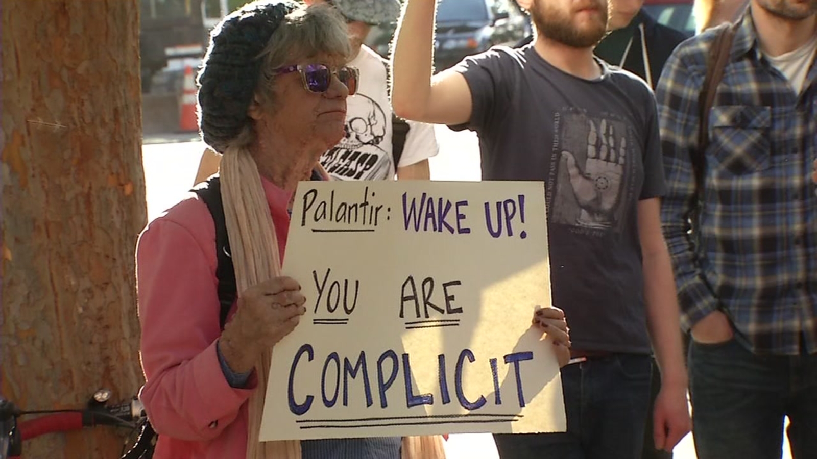 A small group of protesters were calling attention to a company he co-founded called Palantir.