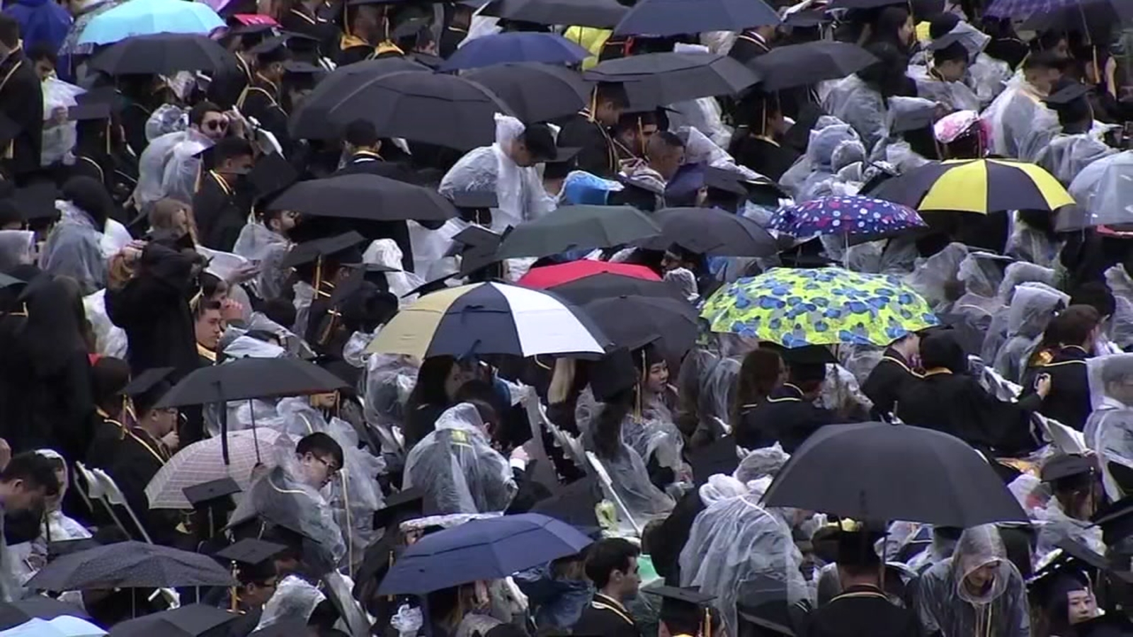 Ponchos and umbrellas replaced Pomp and Circumstance at this year's Commencement at U.C. Berkeley. The rain started, just after graduates, parents and friends took their seats inside Memorial stadium. A speaker told the crowd to hang in there.