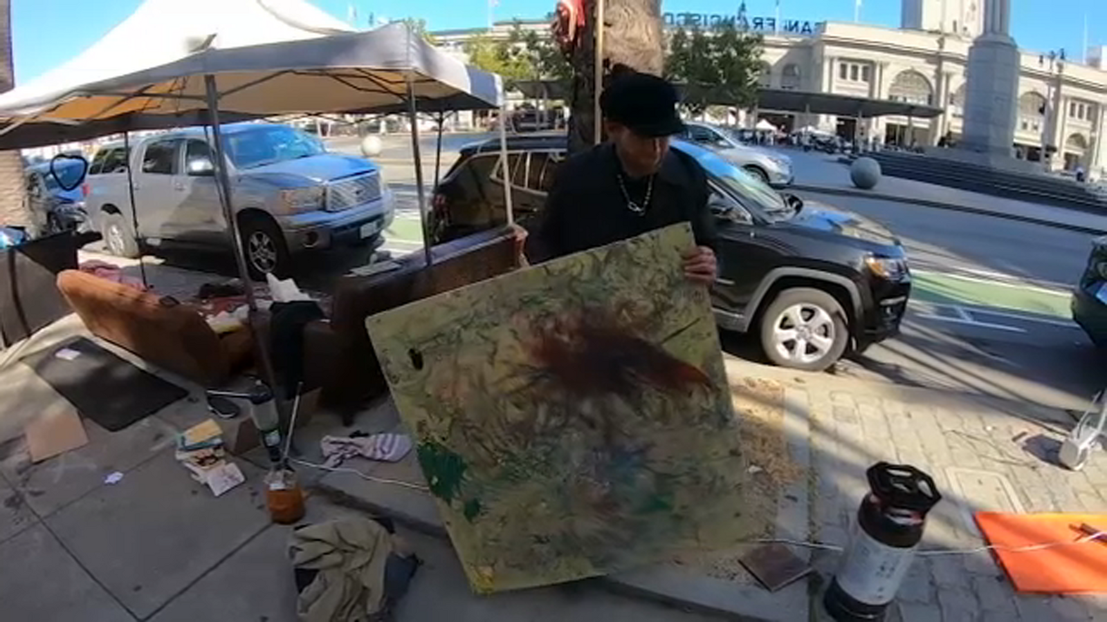 Then, when a sudden wind gust brought one of Kenny's paintings crashing down onto a car, he rethinks his encampment.