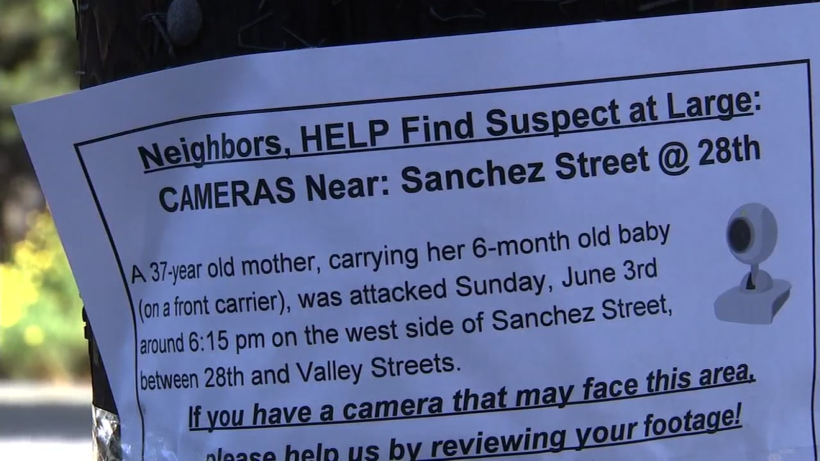 It was June 3rd, just after 6 p.m. Surveillance video from a Nest cam shows the mother crossing 28th Street on Sanchez. After she walks out of frame, you can hear her screaming and seconds later, her baby crying. Someone appears to run up the hill after the attack.