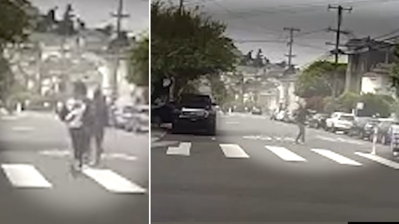Police say that's when the alleged assailant struck again. Surveillance video from a Tesla across the street shows this time, the suspect punched the victim in the face.