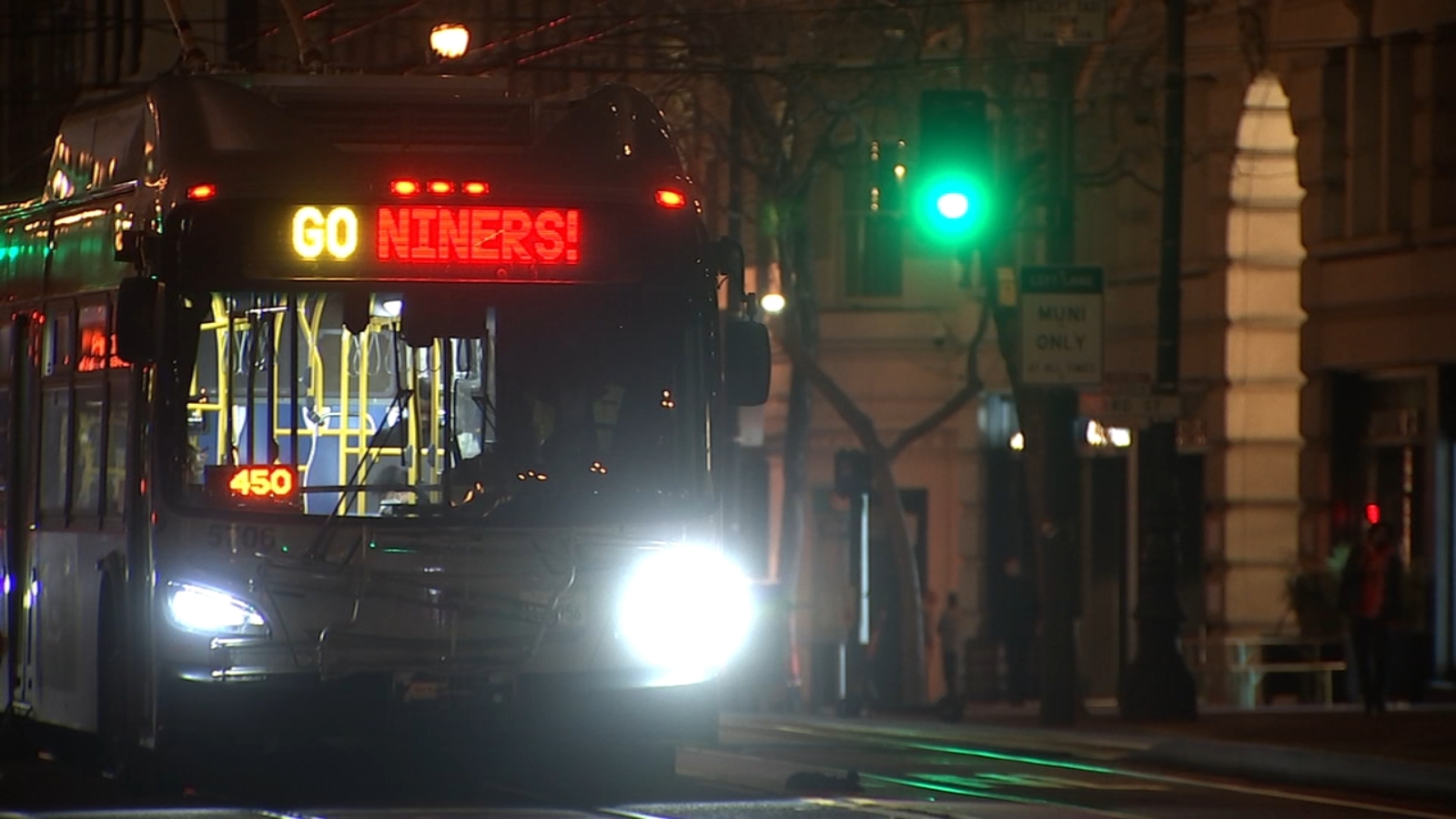 Some MUNI buses will also be re-routed in some areas of the City. The MUNI fleet is now also repping the 49ers, displaying "GO NINERS!" messages.
