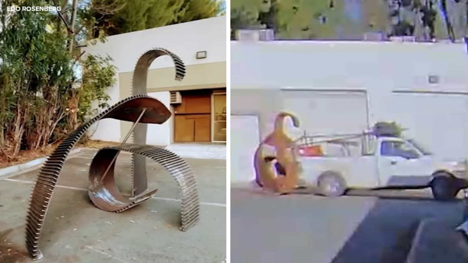 Surveillance video shows a truck taking off with artist Edo Rosenberg's 600-pound metal sculpture bolted to the ground in San Jose.