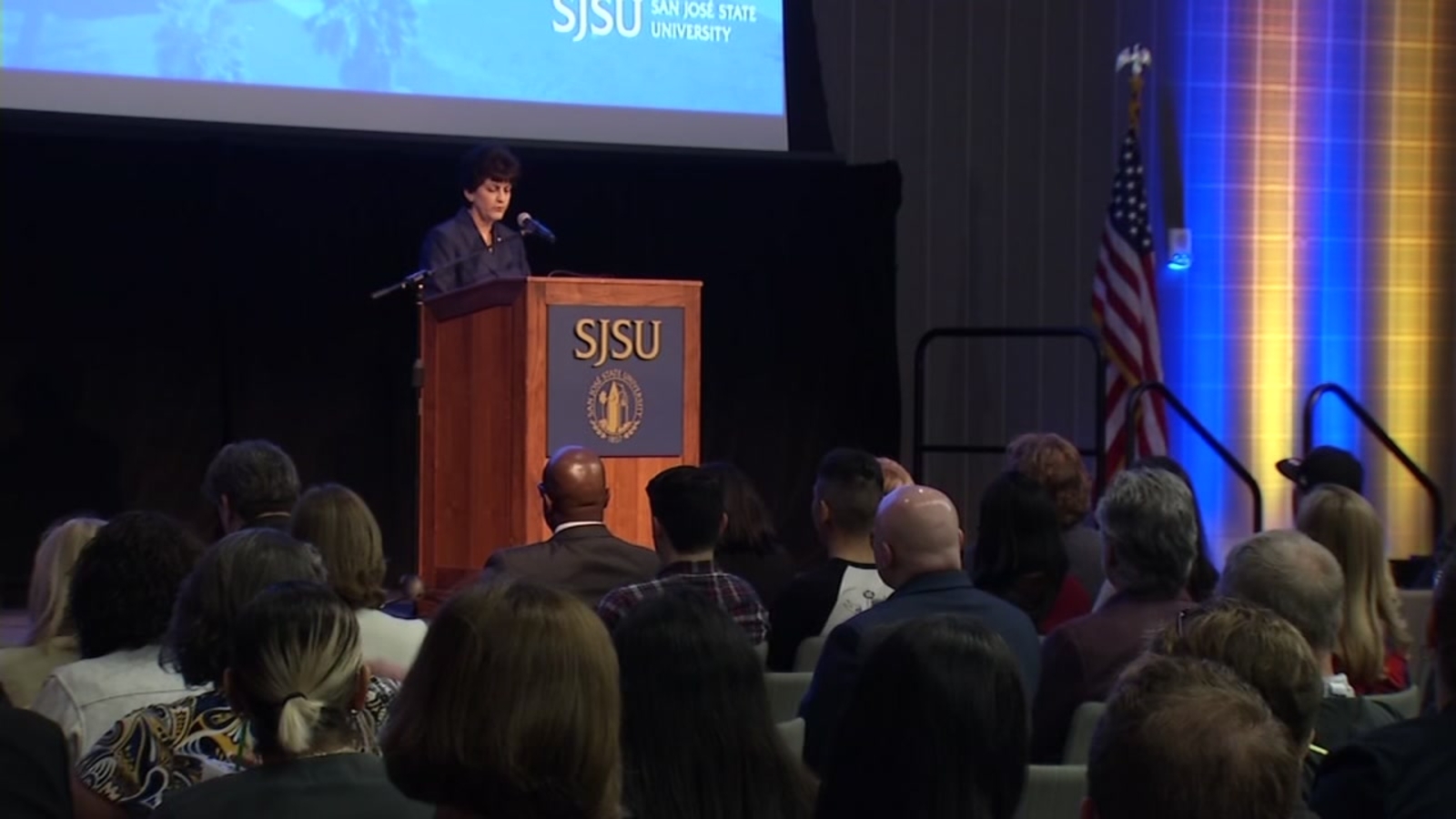Members of the Student Homeless Alliance sat just three rows from President Mary Papazian as she presented her "State of the University" address at the Student Union before students, faculty and staff. The Student Homeless Alliance has been pressuring the university to help students who have no place to sleep at night.