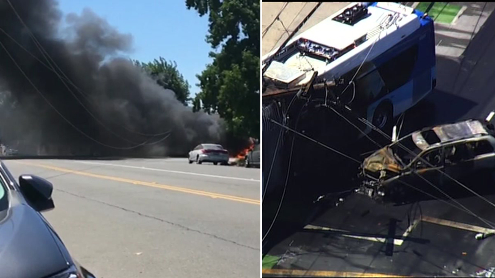 SAN JOSE, Calif. (KGO) -- No one was seriously injured when an SUV collided with a Santa Clara Valley Transportation Authority bus and caught fire in East San Jose on Monday afternoon.