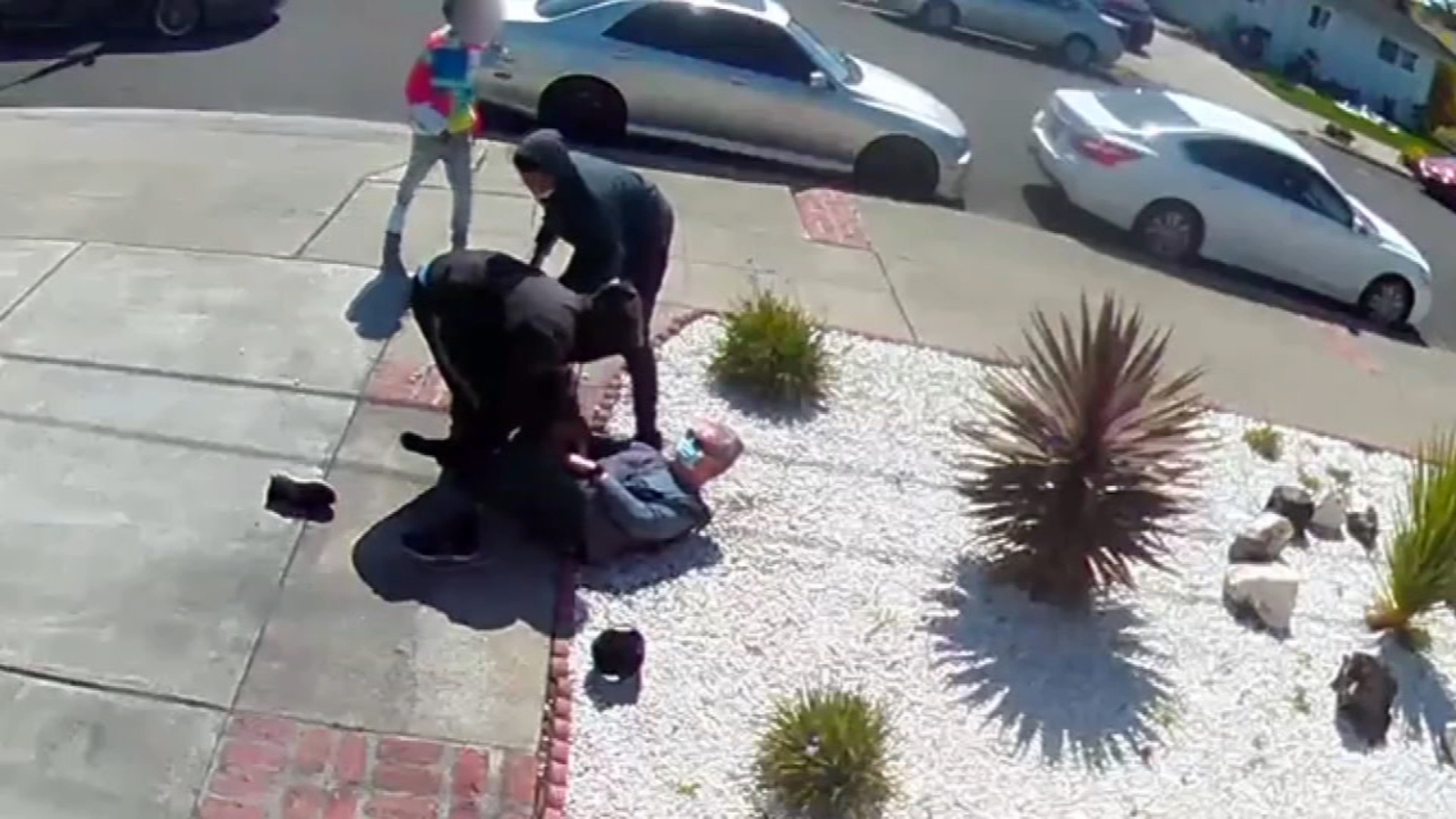 Video shows the man being attacked in his own driveway last Saturday, as one of the suspects waiting in a getaway car.