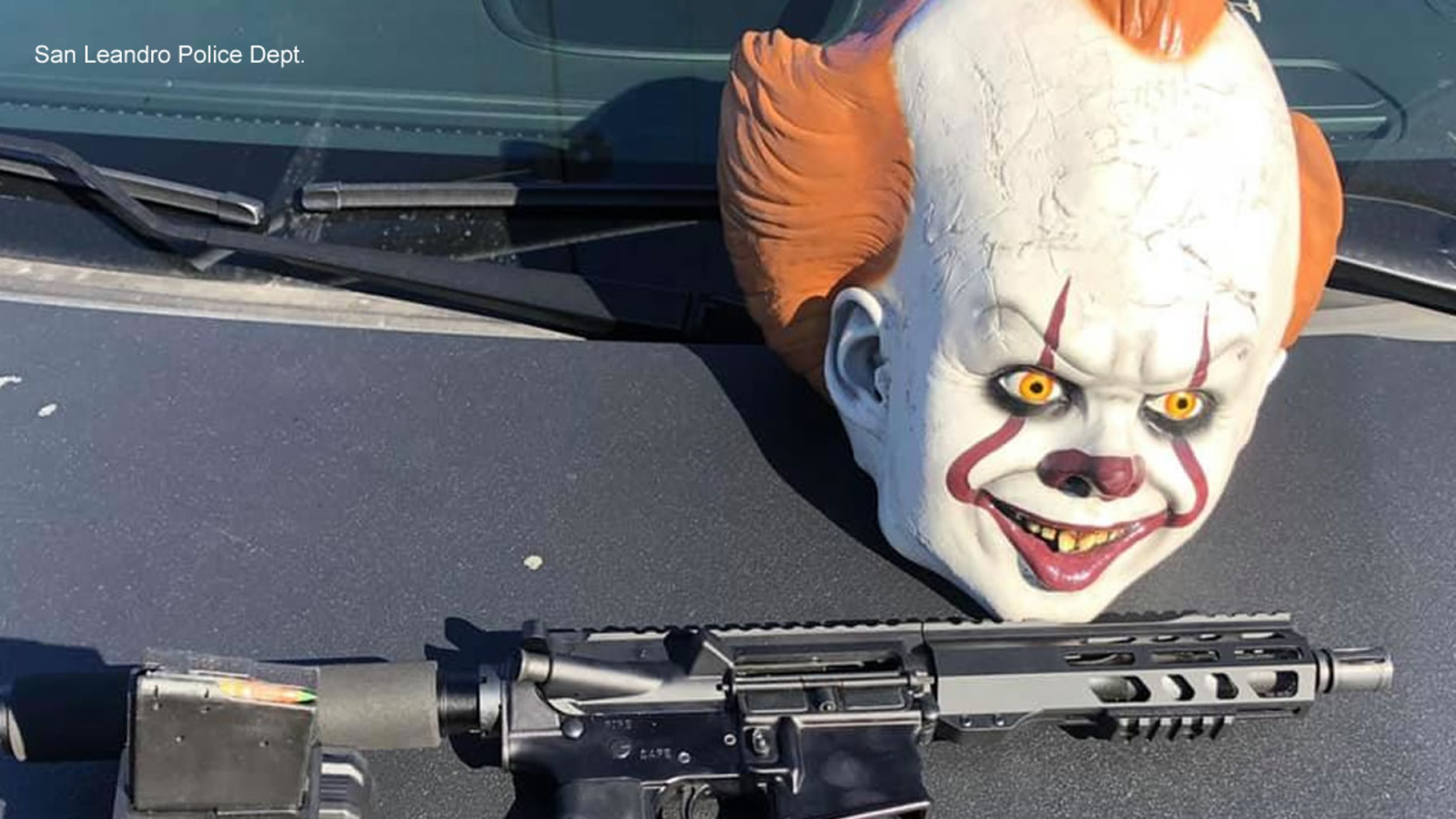 SAN LEANDRO, Calif. (KGO) -- San Leandro police arrested a man during a traffic stop after they found an "It" clown mask, marijuana and a gun in the car.