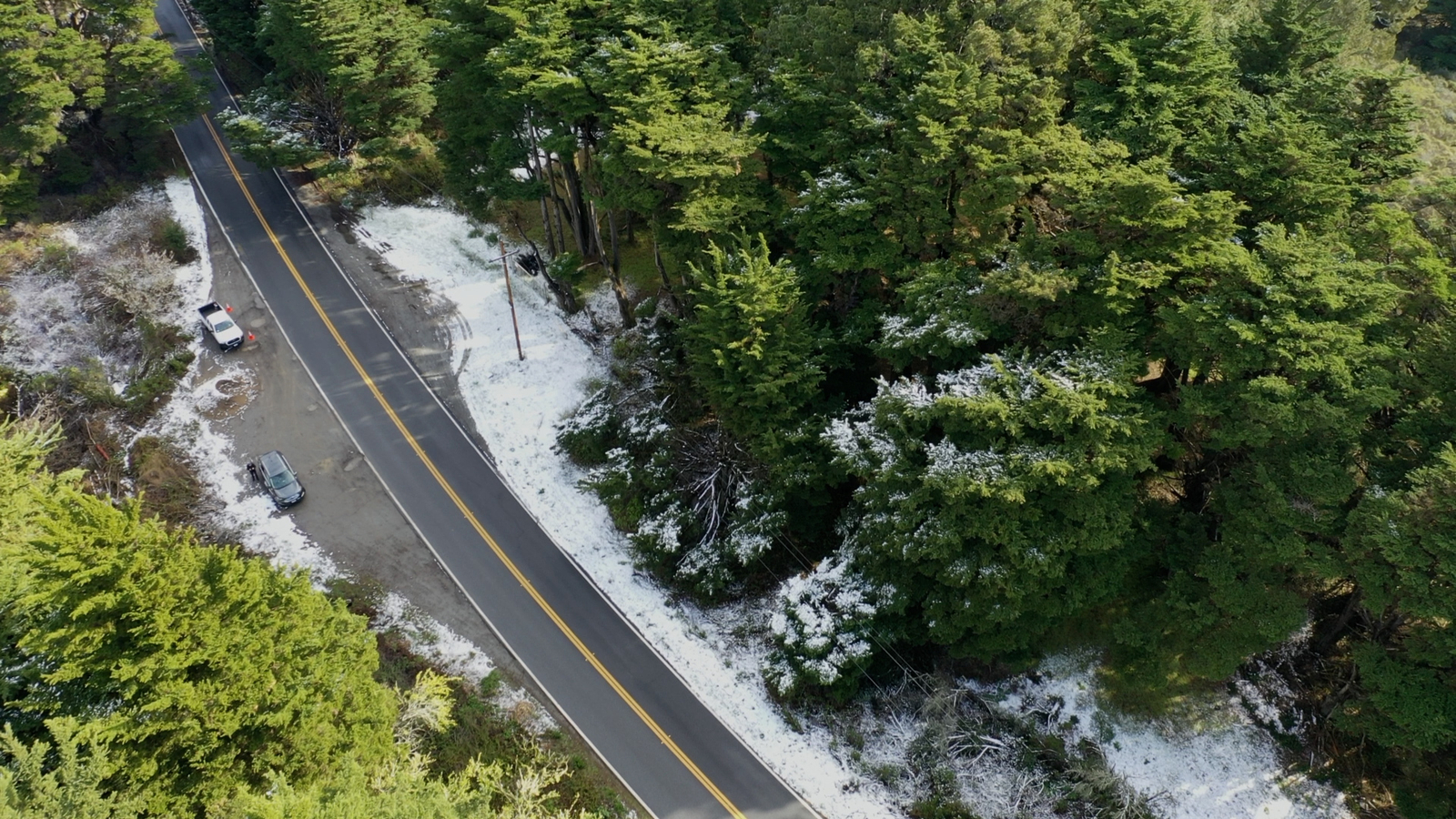 DRONEVIEW7 video shows the snow-dusted grounds and trees by Highway 35 near Skyline Boulevard in San Mateo County.
