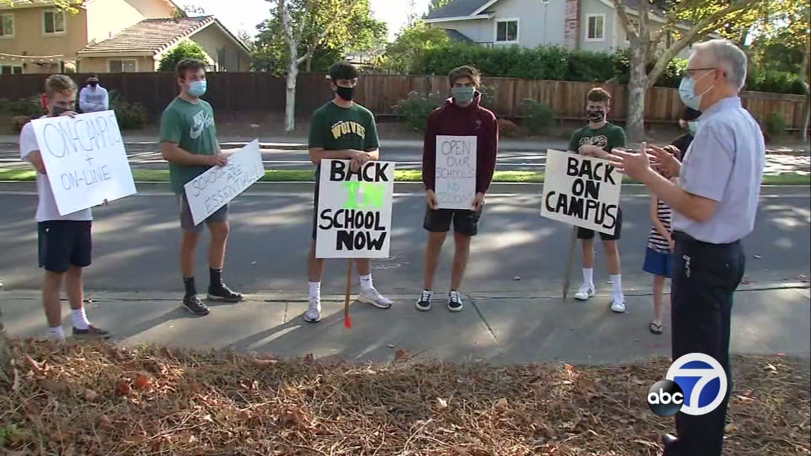 DANVILLE, Calif. (KGO) -- San Ramon Valley High School students held a sit-in outside of San Ramon Valley Unified's district office Monday asking that learning return to the classroom now that Contra Costa County moved to the red tier.
