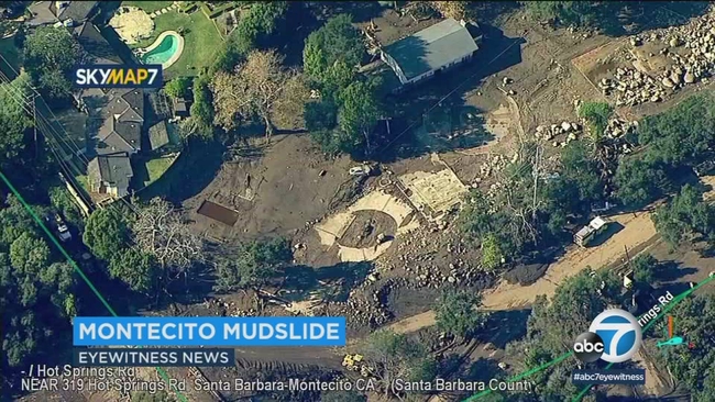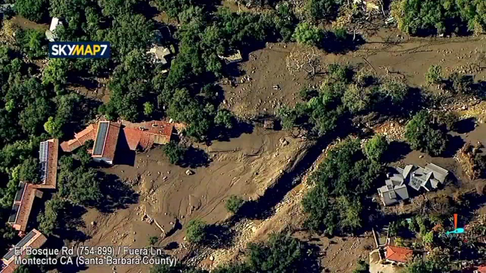 MONTECITO, Calif. -- Amid ongoing search-and-rescue and cleanup operations in Montecito, a satellite view from AIR7 HD shows the destruction wrought by flooding and mudslides in the area.