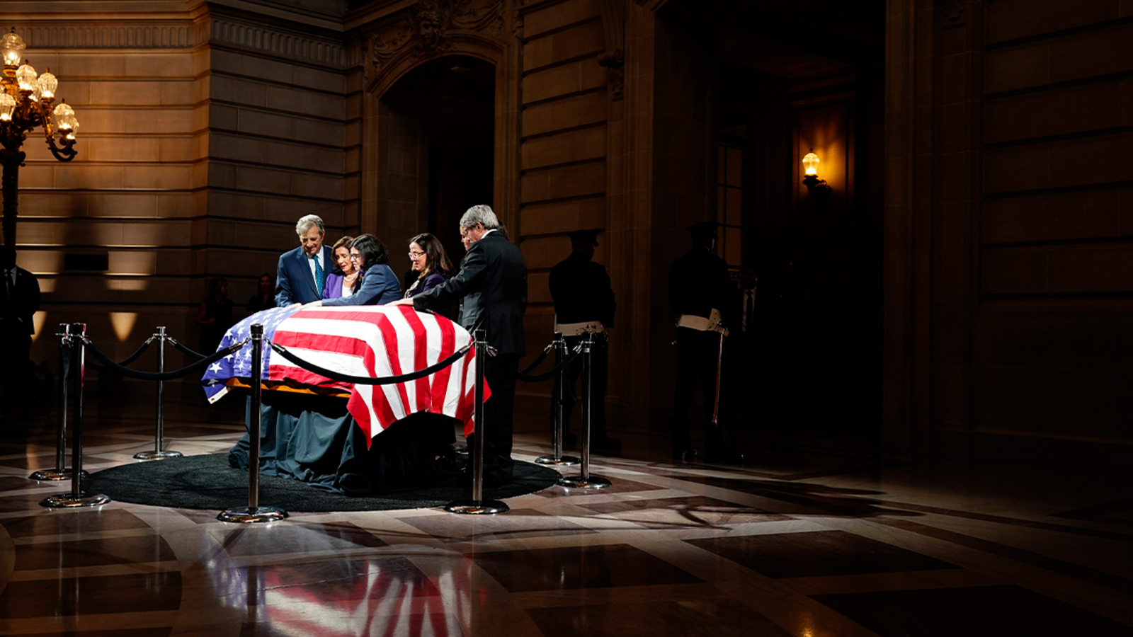 City Hall's rotunda was echoing with music on a solemn day. One by one, members of the public filed by the flag-draped casket to pay respects and say goodbye to U.S. Sen. Dianne Feinstein in the place where her political career began.