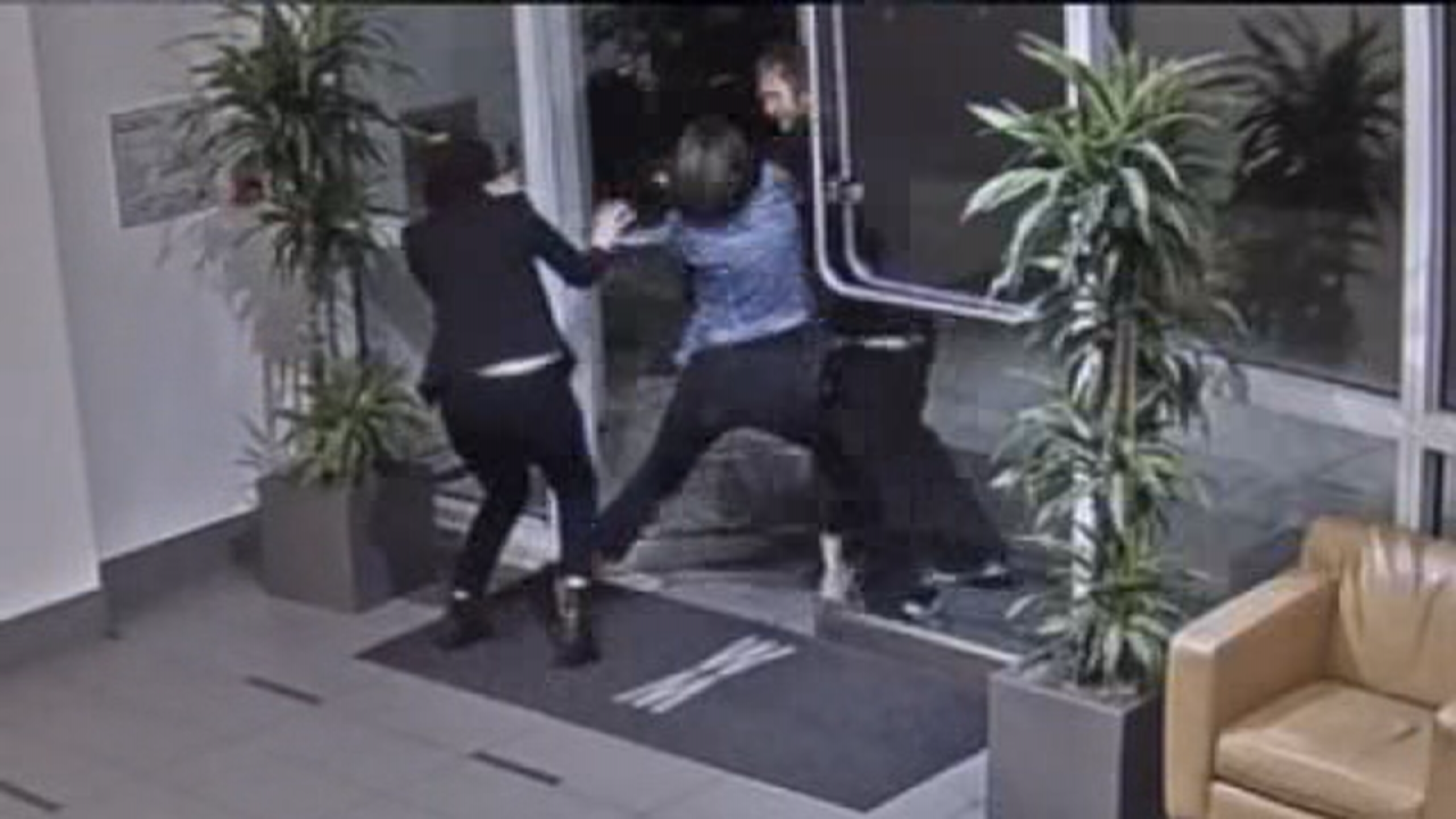 Surveillance video showed the 25-year-old man grabbing the leg of Paneez Kosarian, and blocking her entrance to the building.