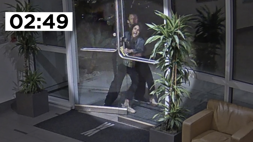 The prosecutor played the security camera video, showing Paneez Kosarian at the front entrance of her apartment building on Aug. 11. As she tries to enter, she's attacked-- allegedly by Austin Vincent.