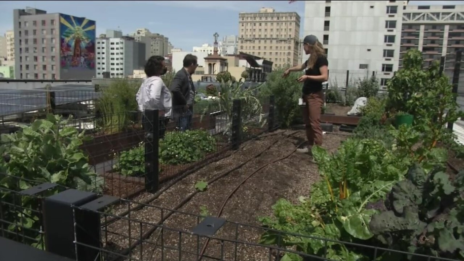 And the efficient use of water even extends to the building's rooftop. That's where Urban Agriculture Coordinator Katelyn Mann tends a sprawling rooftop garden, surrounded by skyline and solar panels. The plants are drip irrigated, and favor drought tolerant California native species.