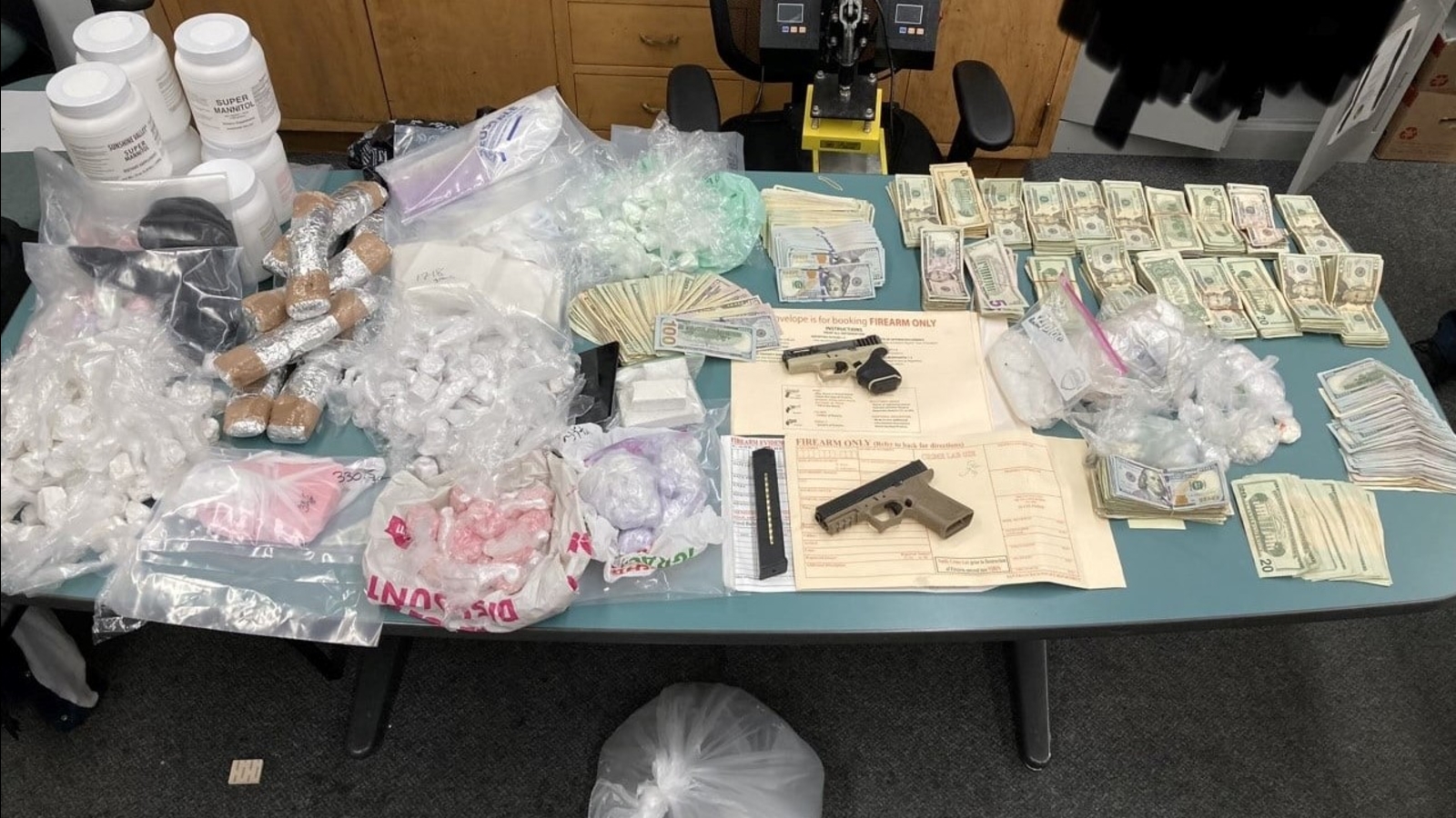 Officers also found several guns, $45,000 in cash, cocaine, heroin and methamphetamine.