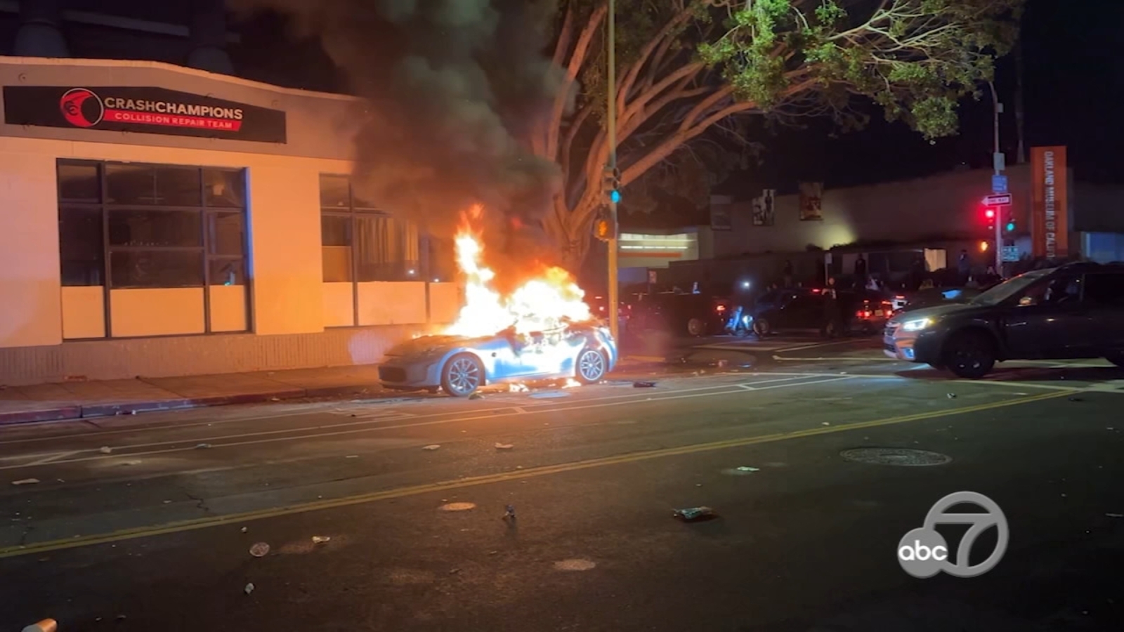 OAKLAND, Calif. (KGO) -- A car went up in flames while dozens of other cars backed up traffic following a sideshow in Oakland early Saturday morning.