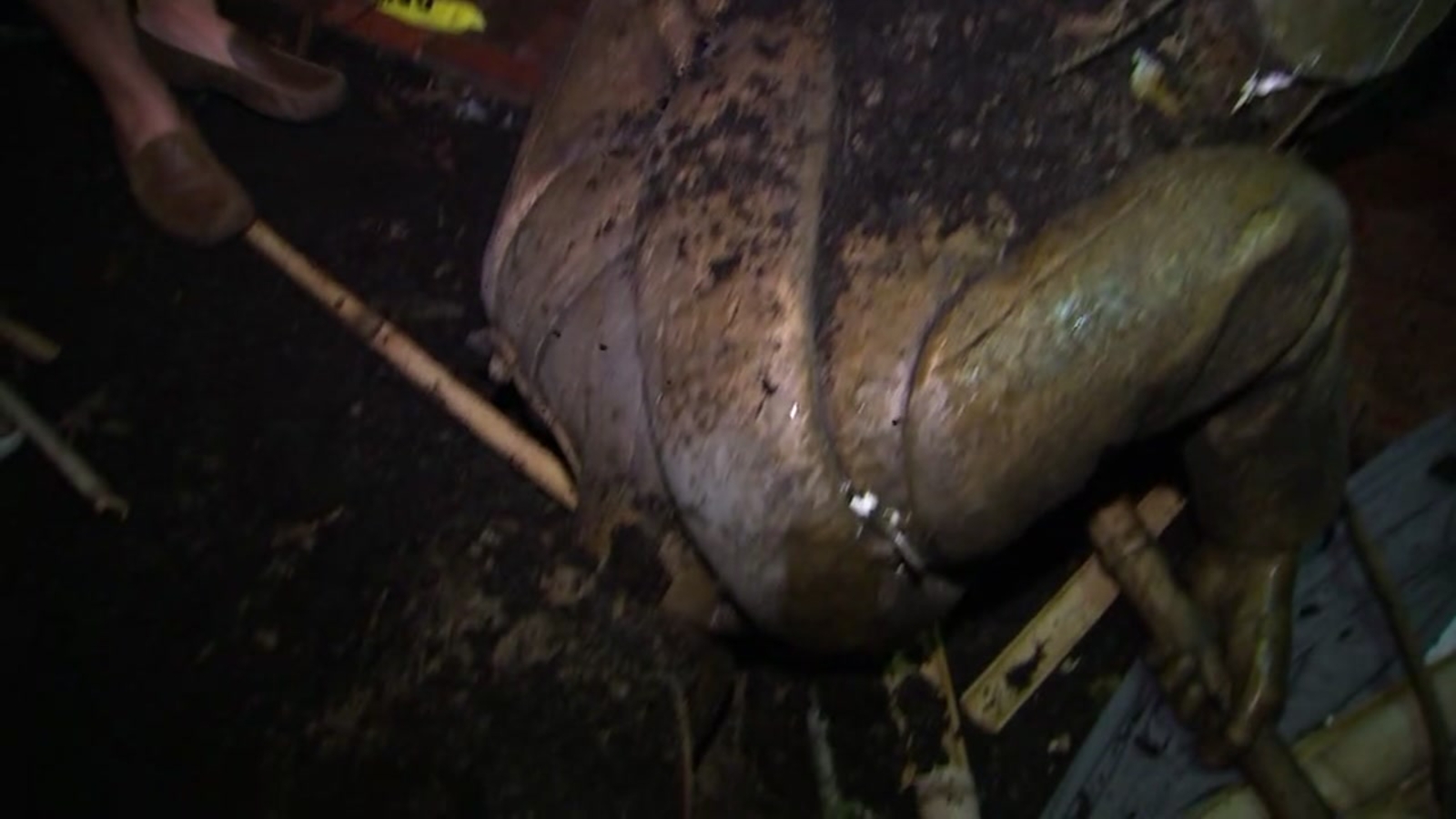 As midnight approached, the statue was picked up by a backhoe and placed into a dump truck.