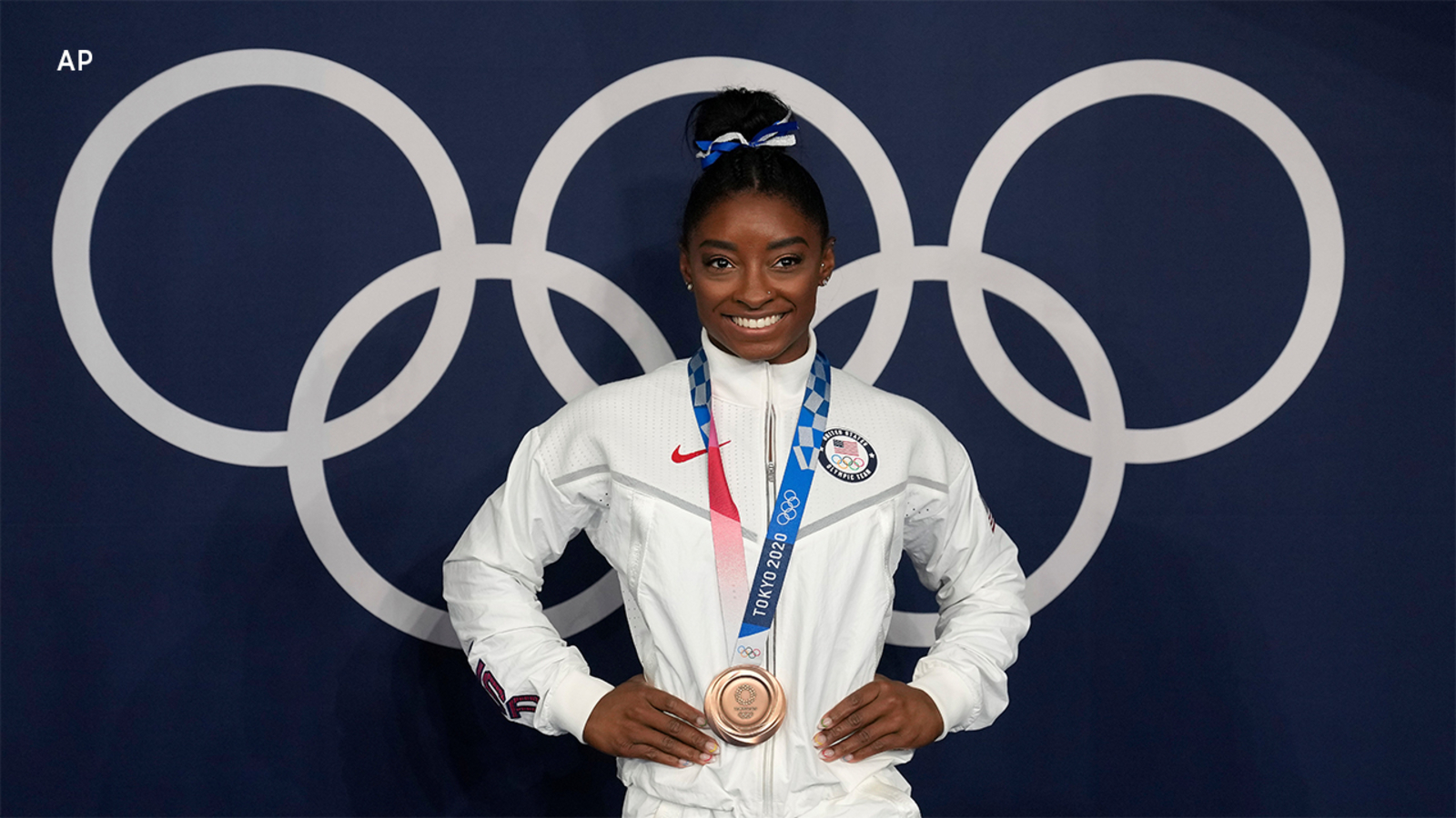 Simone Biles won bronze during the balance beam final a week after she took herself out of several competitions to focus on her mental health.
