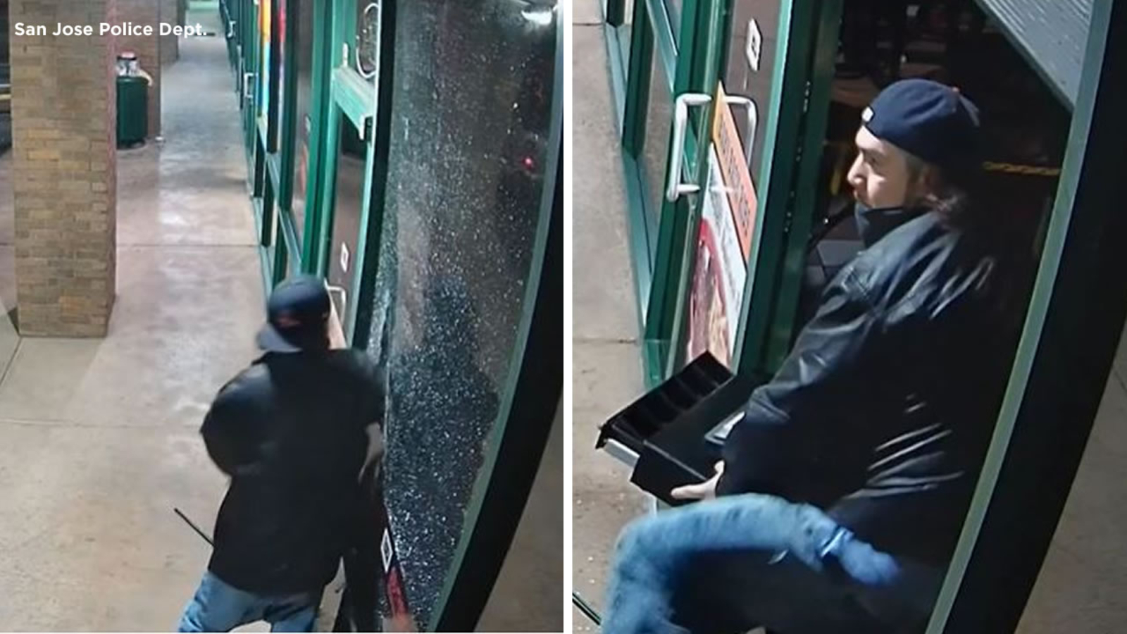 Surveillance video released by SJPD shows a burglar smashing the window of a business, entering, then exiting with a cash register