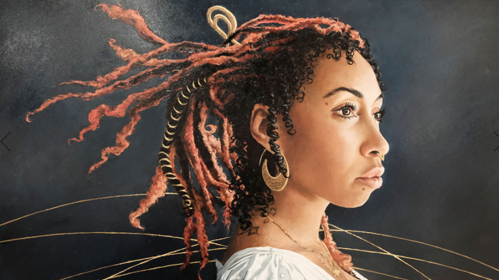 "Did they have to put it so high?" we asked Andrea McCoy Harvey, an artist who teaches elementary school kids in the East Bay. We found her portrait, called Afro Goddess, hung near the top of the tall ceiling.