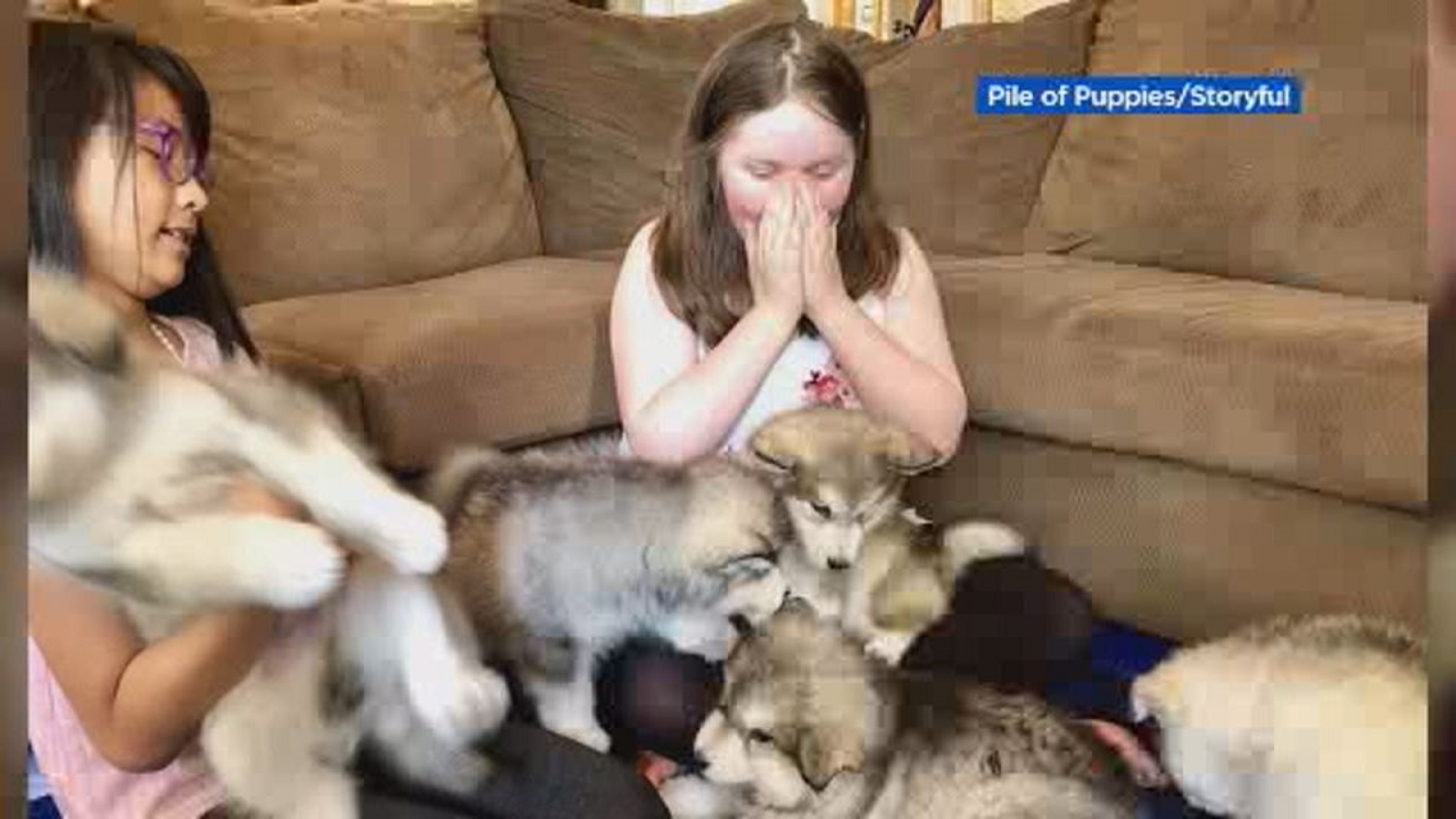 OREGON (KGO) -- A special surprise for a little girl fighting a serious illness. Lily was covered by a pile of puppies!