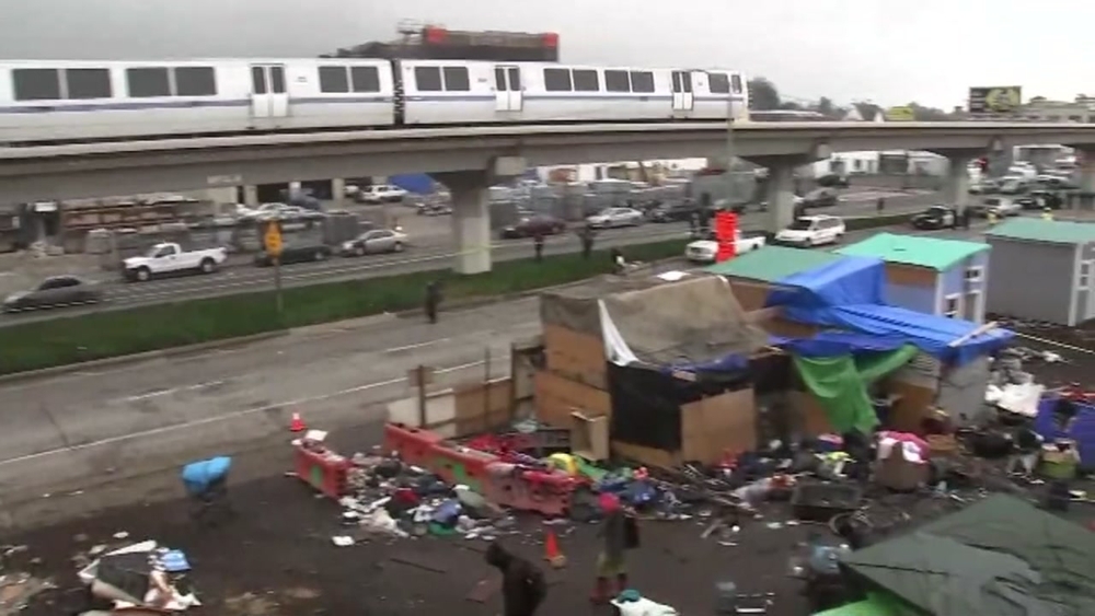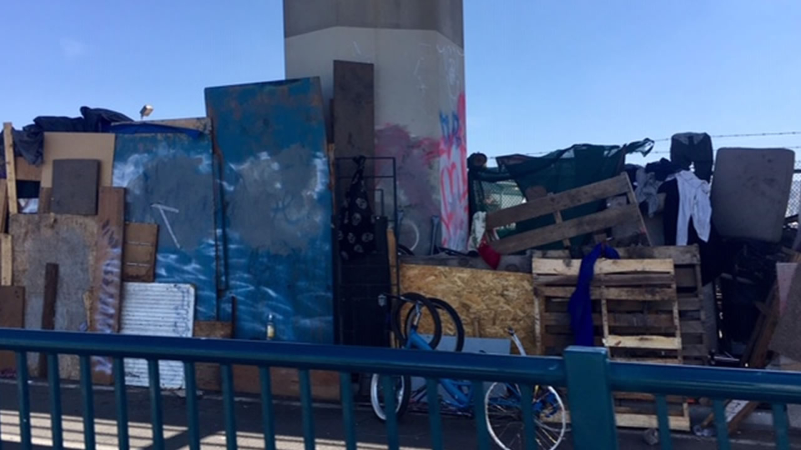 Oakland's fire marshal deemed the structures a fire hazard earlier this month. The homemade homes run between 81st and 85th avenues along San Leandro Street. In mid-July, ABC7 News saw that the mostly wooden structures extend in some cases two stories high, all the way up to the bottom of the concrete platform that carries the BART tracks.