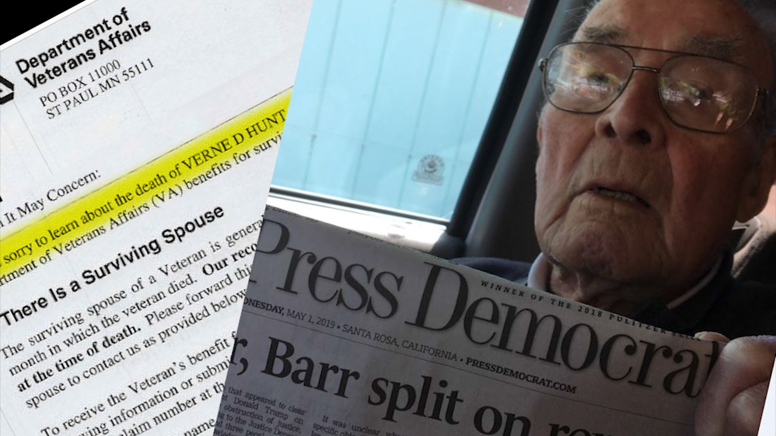 His family contacted one VA office after another, submitted piles of documents, even sent "proof of life" including a photo of Vern holding that day's newspaper and another of Vern holding the very letter that said he's dead.