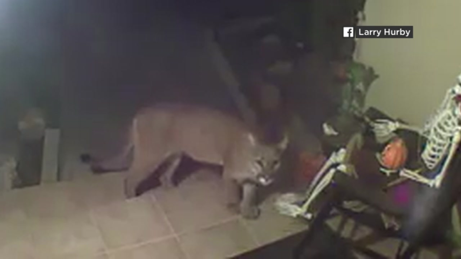 Surveillance video taken a few days ago shows the curious cat checking out the Halloween decorations at the house. The mountain lion looked at the pumpkin and the skeleton decorations before glancing at the surveillance camera.