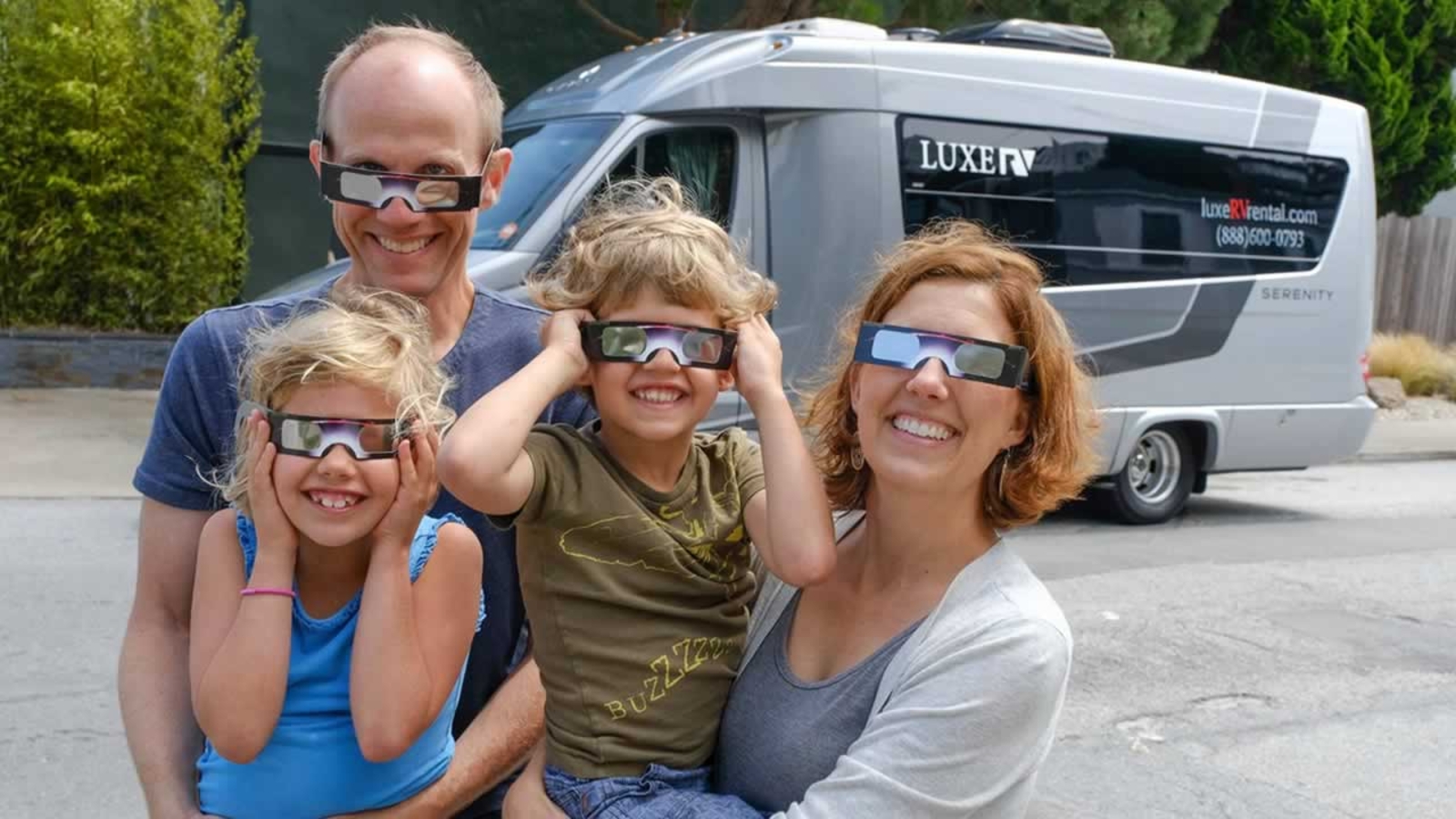 Moments later, the family put on their eclipse glasses and posed for a commemorative photograph. Then, they left in an RV with the name Serenity.