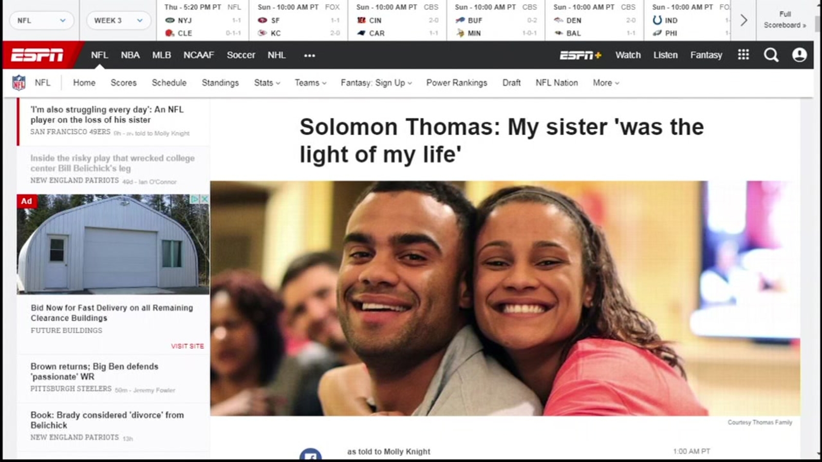 SAN FRANCISCO (KGO) -- San Francisco 49er Solomon Thomas shared heart-wrenching details about his sister's suicide. He spoke with ESPN about his sister Ella.