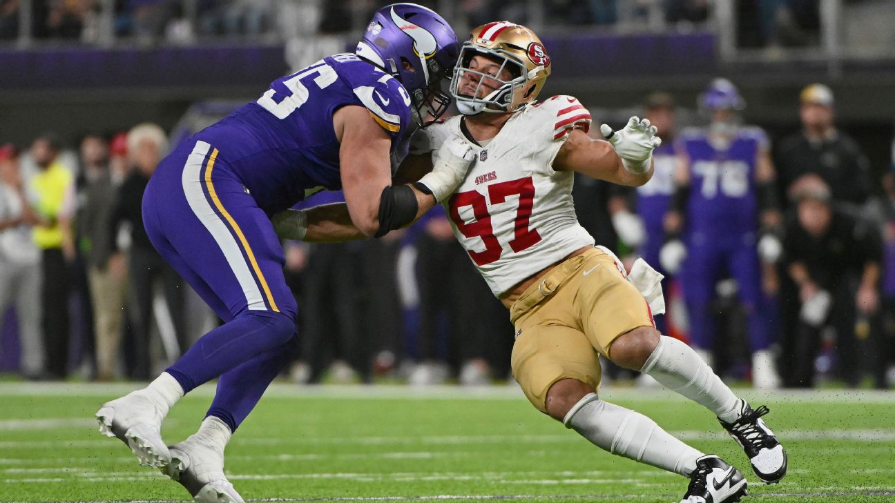 With the exception of the injury-ravaged 2020 season, the engine that's driven these Niners to three NFC Championship Games in four years has been a defensive line that has never lacked for resources. Which is why, when that Bosa-led group manages a pressure rate of 25% and fails to sack Minnesota Vikings quarterback Kirk Cousins on any of his 44 dropbacks -- which is what happened in Monday night's loss -- it stands out above any other deficiency.