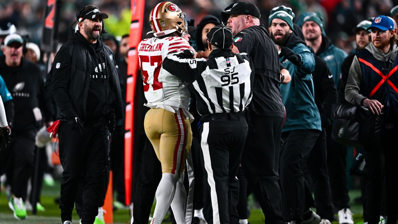 On Monday, the league office told ESPN that it would review the sideline incident between Greenlaw and DiSandro. Greenlaw and Niners coach Kyle Shanahan said Wednesday they had not heard from the NFL and were expecting no further discipline for Greenlaw beyond the 15-yard penalty and ejection he received Sunday. The matter remains under review by the league office, ESPN's Adam Schefter reported Wednesday, and there is expected to be a follow-up with the Eagles this week.