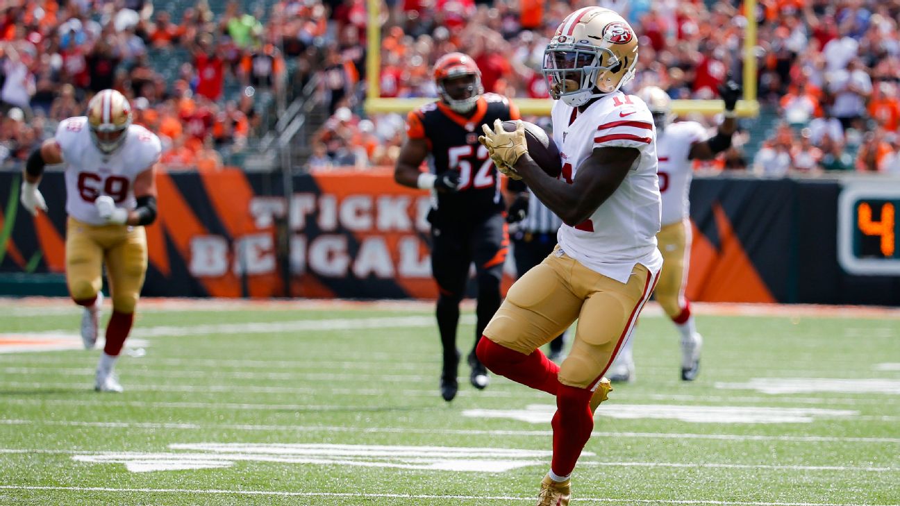 CINCINNATI -- One way for San Francisco 49ers quarterback Jimmy Garoppolo to knock the rust off from last year's torn ACL is to throw to wide-open receivers. And they don't get much more open than Niners wideout Marquise Goodwin on the Niners' first offensive possession Sunday in Cincinnati.