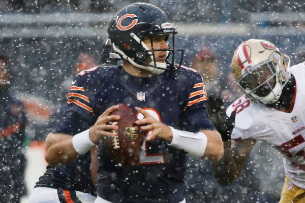 Bears quarterback Matt Barkley and San Francisco's Colin Kaepernick went 0-for-3 combined as a steady snow fell at Soldier Field.
