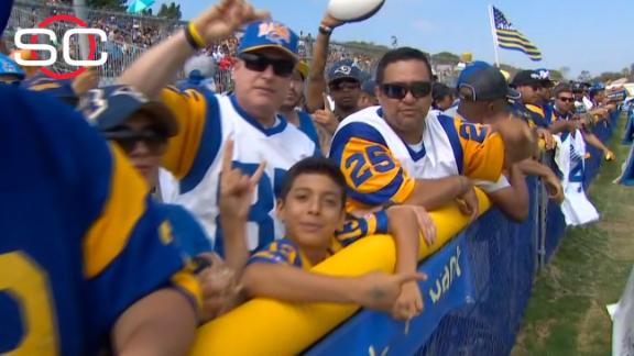 From the moment they stepped off the team bus Monday, the Rams were serenaded by several thousand jersey-wearing, flag-waving fans celebrating a Southern California homecoming. They chanted "L.A. Rams!" while the players took the practice fields in Oxnard, an hour west of Los Angeles, and they held banners reading "Welcome Home!" and "We Missed You!"
