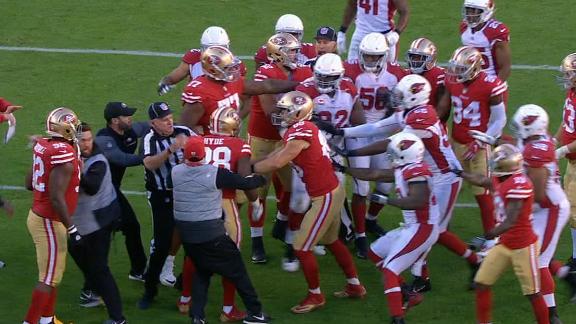 SANTA CLARA, Calif. -- By the official stat book, San Francisco 49ers quarterback C.J. Beathard took 16 hits from the Arizona Cardinals in Sunday's loss. But it was one that didn't count toward that total that set off a brief fight between the two teams and resulted in the ejection of three players.