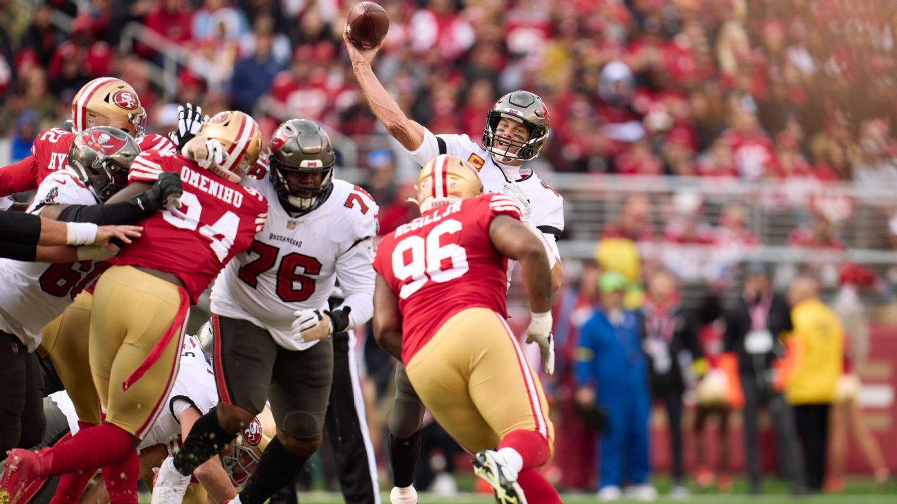 As if throwing two interceptions in his return home to the San Francisco Bay Area and losing 35-7 weren't enough, Buccaneers quarterback Tom Brady was asked by 49ers linebacker Dre Greenlaw to autograph the ball he intercepted.