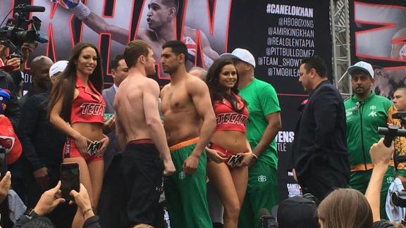 LAS VEGAS -- In a wild outdoor scene, middleweight champion Canelo Alvarez and challenger Amir Khan, the welterweight contender moving up in weight, were both exactly on the 155-pound catchweight limit at the weigh-in Friday afternoon.