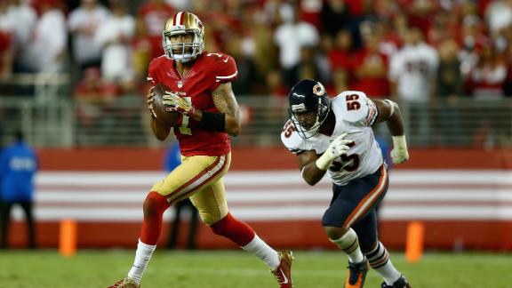 Kaepernick threw three interceptions in the game and also lost a fumble as the Bears rallied from deficits of 17-0 and 20-7 to win.