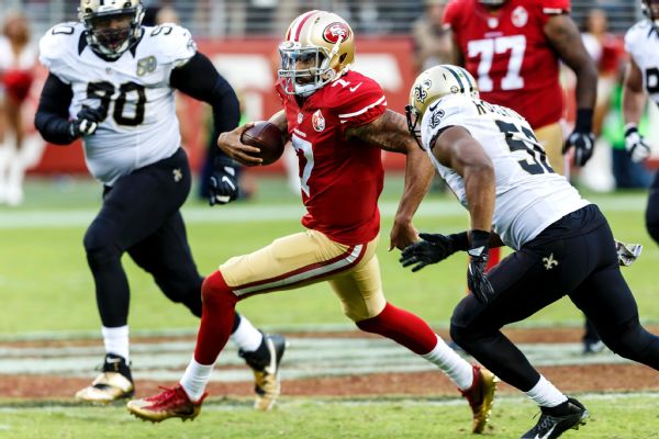 Kaepernick, 29, has taken a stance against racial inequality and oppression all season by kneeling during the national anthem. He stopped standing for the anthem during preseason games and has continued his protest throughout the regular season -- a gesture denounced by Trump.