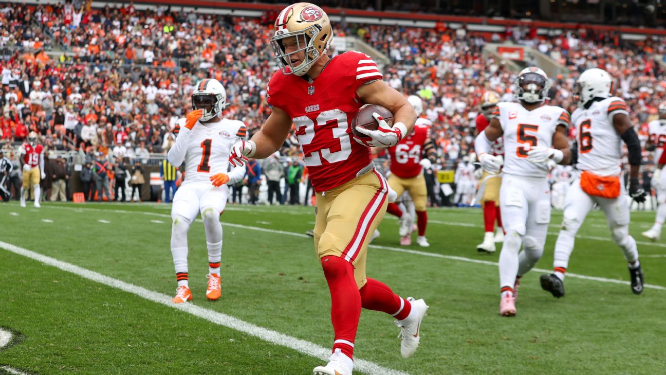 With McCaffrey out Sunday, the Niners turned to the combination of Elijah Mitchell and Jordan Mason in his place. Mitchell, in his first game back from a knee injury, had two carries for negative-3 yards. Mason had five attempts for 27 yards and a touchdown.
