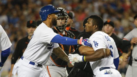 LOS ANGELES -- Benches emptied in the first inning of the Los Angeles Dodgers' 4-2 win over the San Francisco Giants on Tuesday night after Madison Bumgarner hit Yasiel Puig with a pitch on the left ankle.