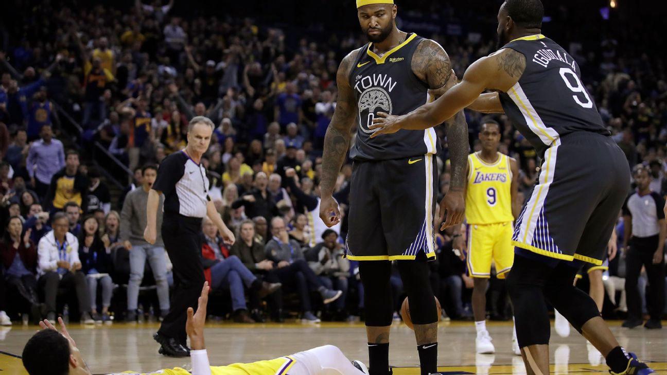 Then,DeMarcus Cousins, coming off a high pick and roll, took a pass from Kevin Durant and drove toward the rim. Kyle Kuzma slid over in an attempt to take a charge only to watch Cousins rise up and dunk on the Lakers forward with the foul, electrifying Oracle Arena and the Warriors.