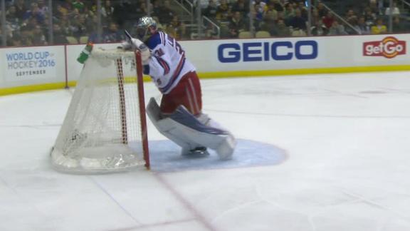 The Rangers goaltender was whistled for delay of game during the odd second-period sequence. It came after Sidney Crosby, Evgeni Malkin and Patric Hornqvist each scored in a three-goal flurry at the end of the period and helped the Penguins to a rare win against their division rival.