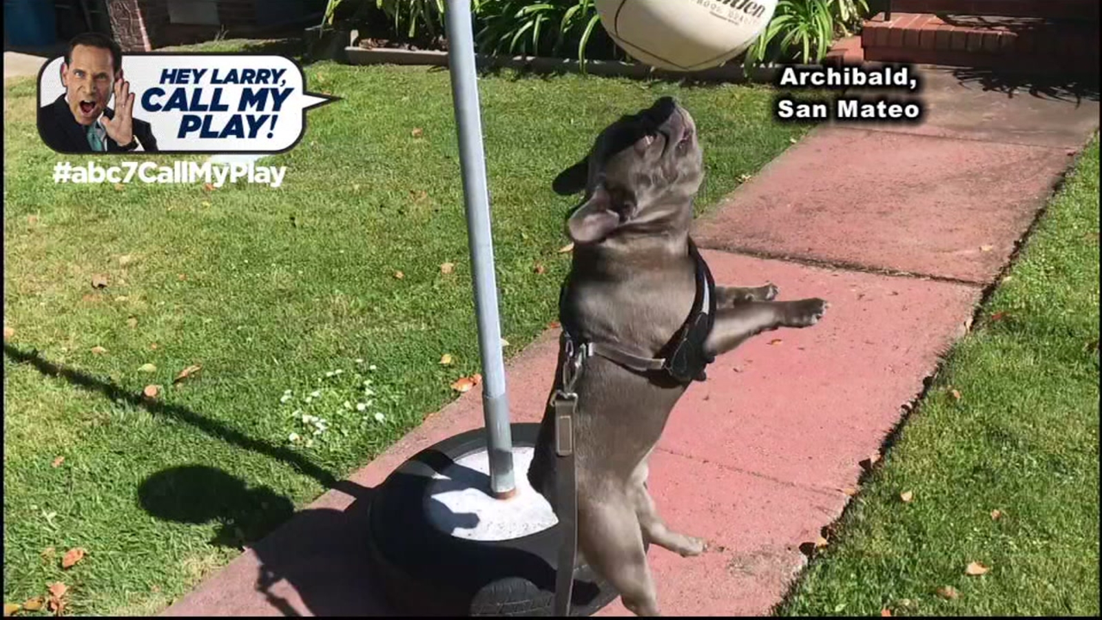 SAN MATEO, Calif. (KGO) -- In this edition of "Hey Larry, Call My Play!" Archibald the 3-year-old blue brindle French bulldog is king of the tether ball courts in San Mateo.