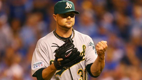 He was on the hill for the A's in the American League wild-card game against the Kansas City Royals and left in the eighth inning with runners on first and second with one out and his team leading 7-4. The Royals eventually won the game 9-8 in 12 innings.